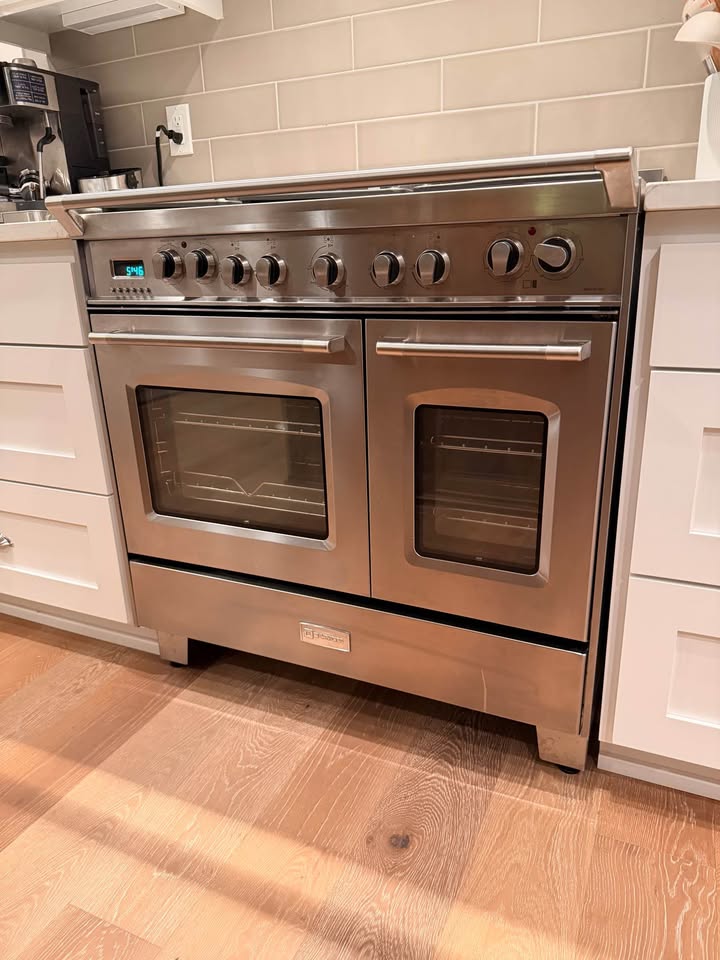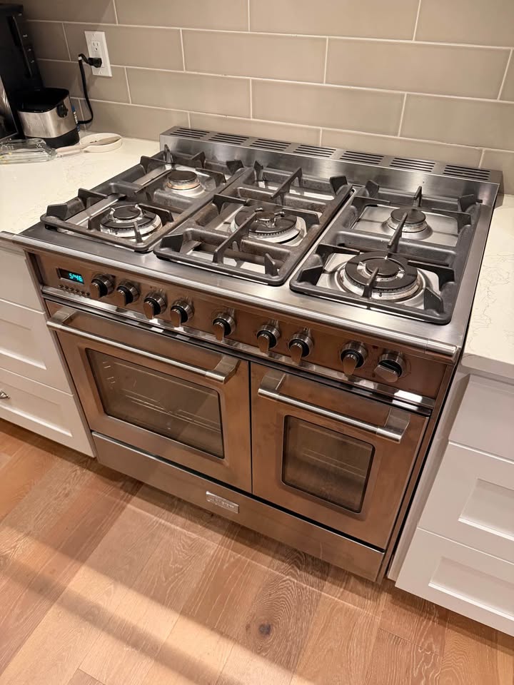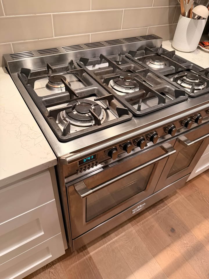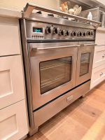 Excellent condition dual fuel range. Made by Verona. The Prestige line. We’re changing out stoves to get one that is all electric. This one has 5 natural gas burners and 2 separate ovens / warming drawer.
