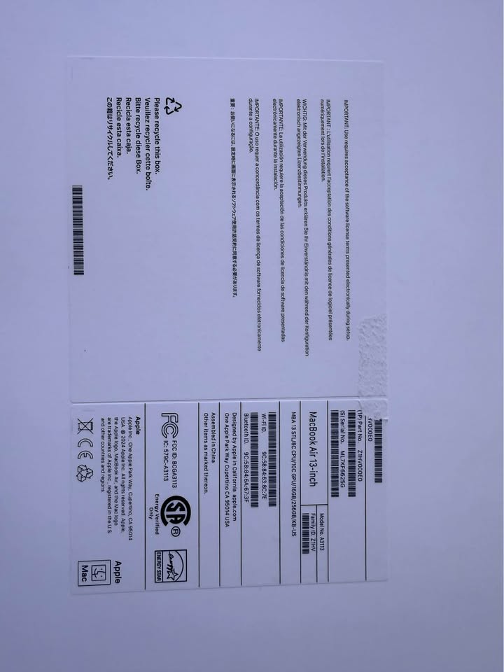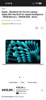 Laptop – Apple M3 chip. 16gb memory and 256gb SSD, silver. It is less than a year old and I have only used it a couple of times. It is in perfect condition, comes with original box and charger. I haven’t wiped it out yet as I wanted to be able to show it unlocked and working before I posted it.