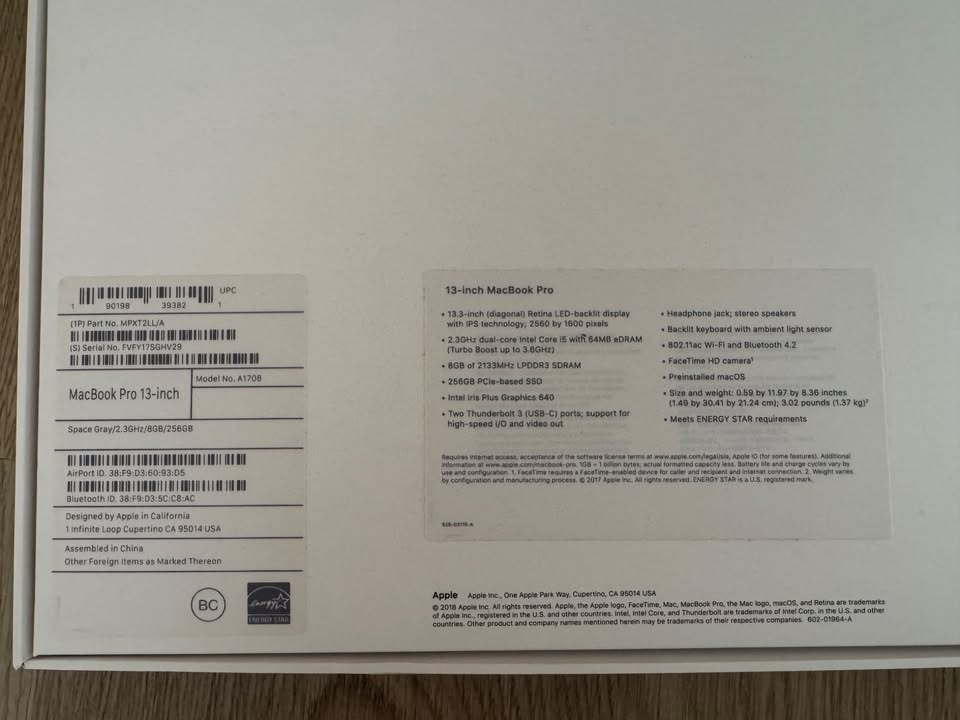 Apple MacBook Pro 13 Inch (A1708) 256GB