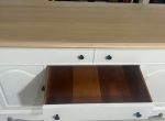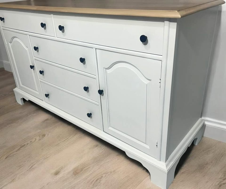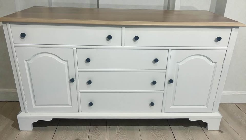 Refurbished in a satin white, this solid wood piece features a warm faux wood top that pairs beautifully with the fresh white finish and new modern black knobs. Designed with a mix of drawers and cabinet storage, including hidden space behind the doors, it offers both style and function while feeling sturdy and well made. A timeless statement piece that fits effortlessly into modern, farmhouse, or transitional spaces.