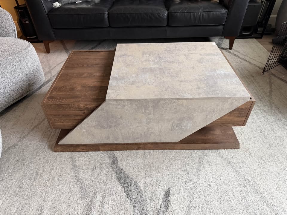 Mid century modern coffee table. Grey and brown finish. Multiple storage compartments. Minor scuff 1 corner about an inch in size.