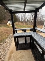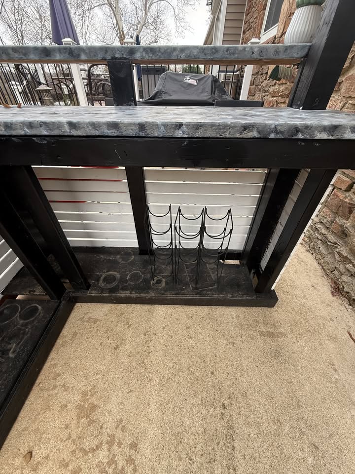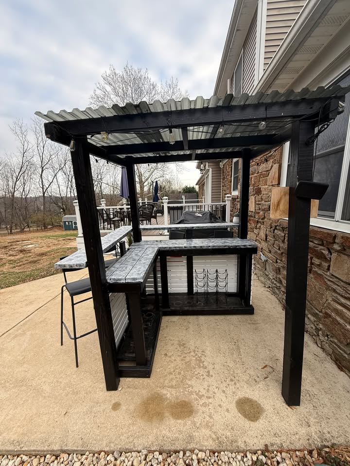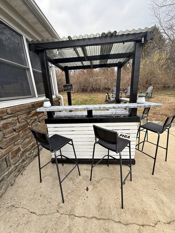 Turn your backyard into the ultimate hangout spot with this awesome custom-built outdoor wood bar – perfect for summer BBQs, fall bonfires, or year-round entertaining! Crafted from durable pressure-treated wood for weather resistance, with the structure painted in a sleek black & white combo, a smooth gray bar top, and a sturdy corrugated plastic roof to keep the rain off your drinks. It’s got that rustic-modern vibe that’ll be the envy of the neighborhood.