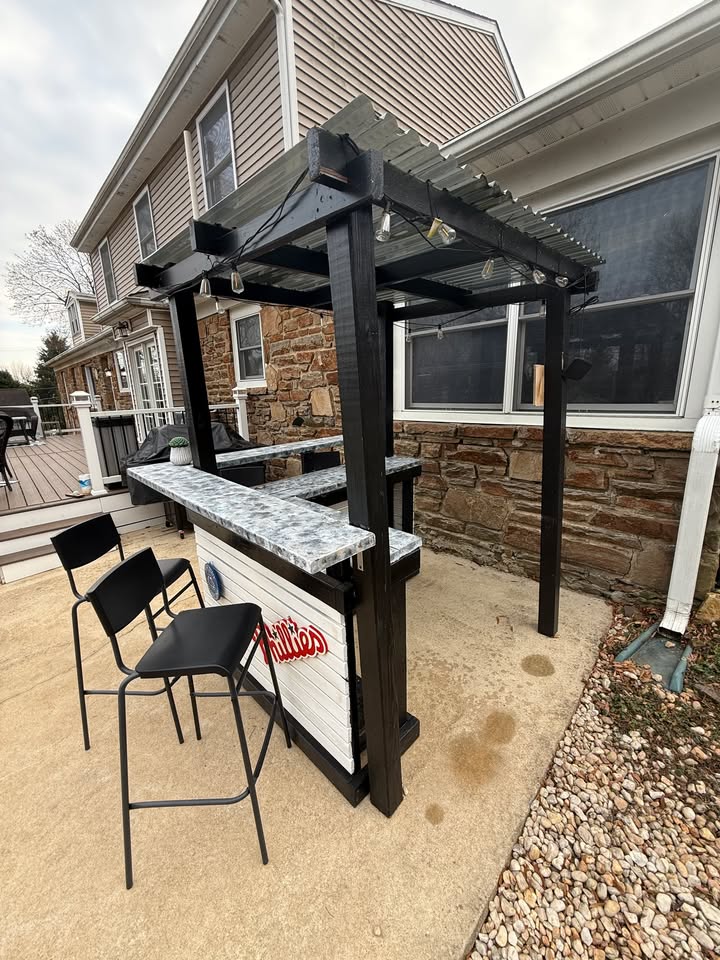Custom Outdoor Wood Bar w/ Roof, 4 Stools & String Lights