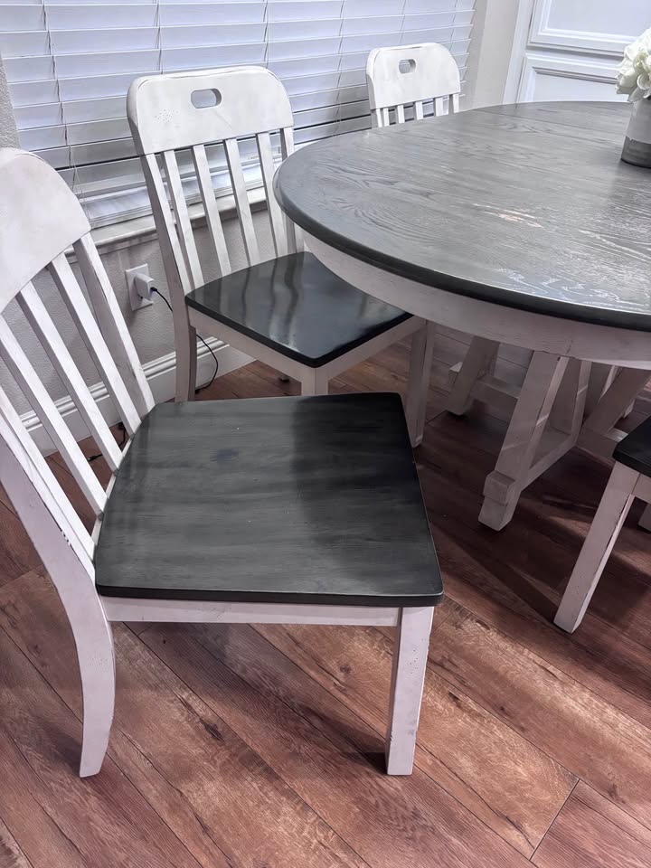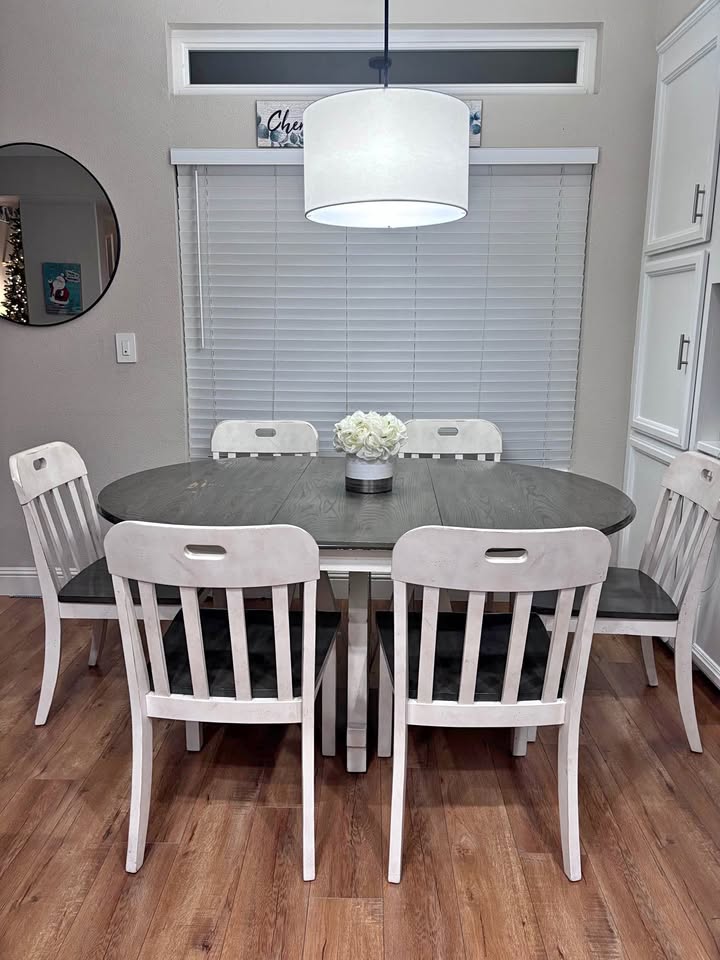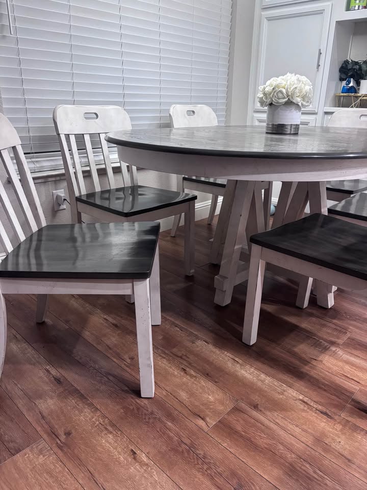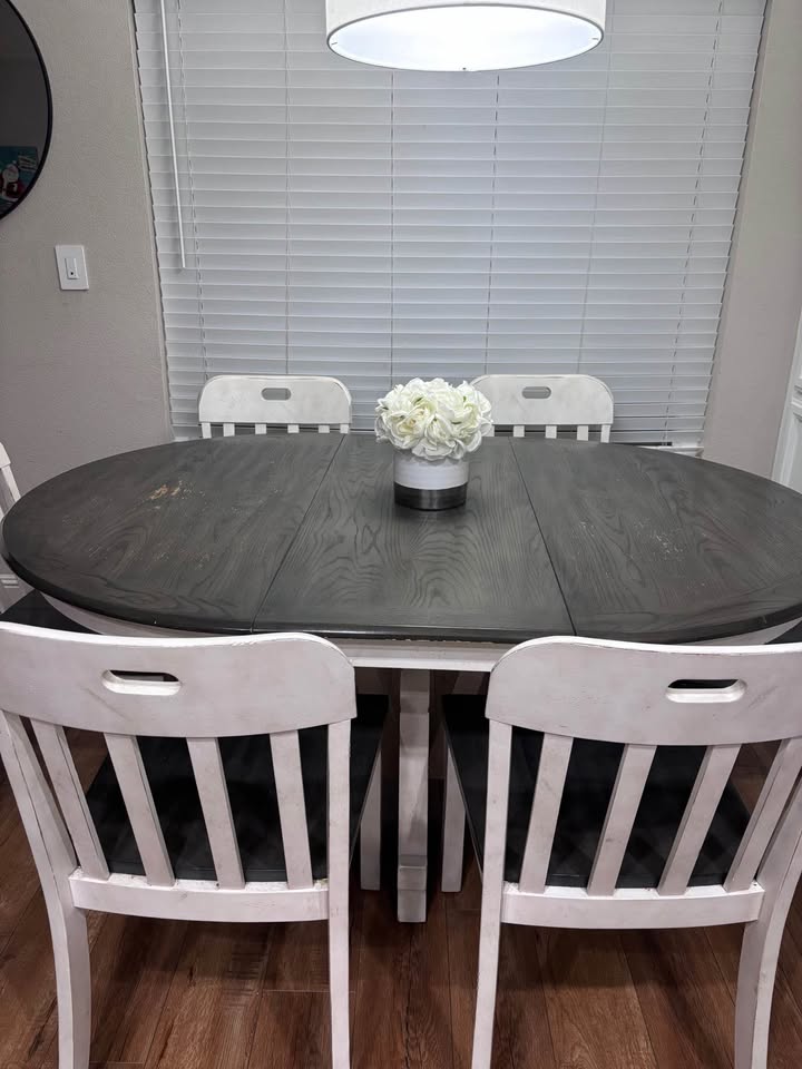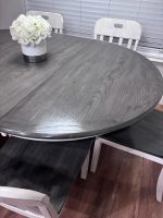 Beautiful farmhouse-style dining table that can be round or oval. Comes with extension leaf.