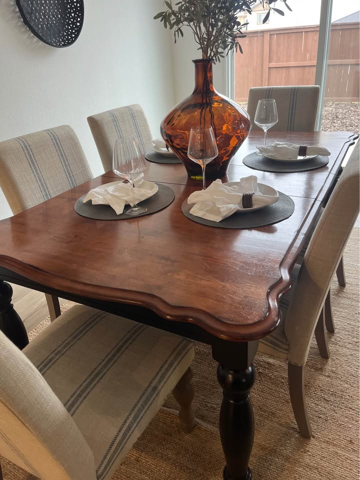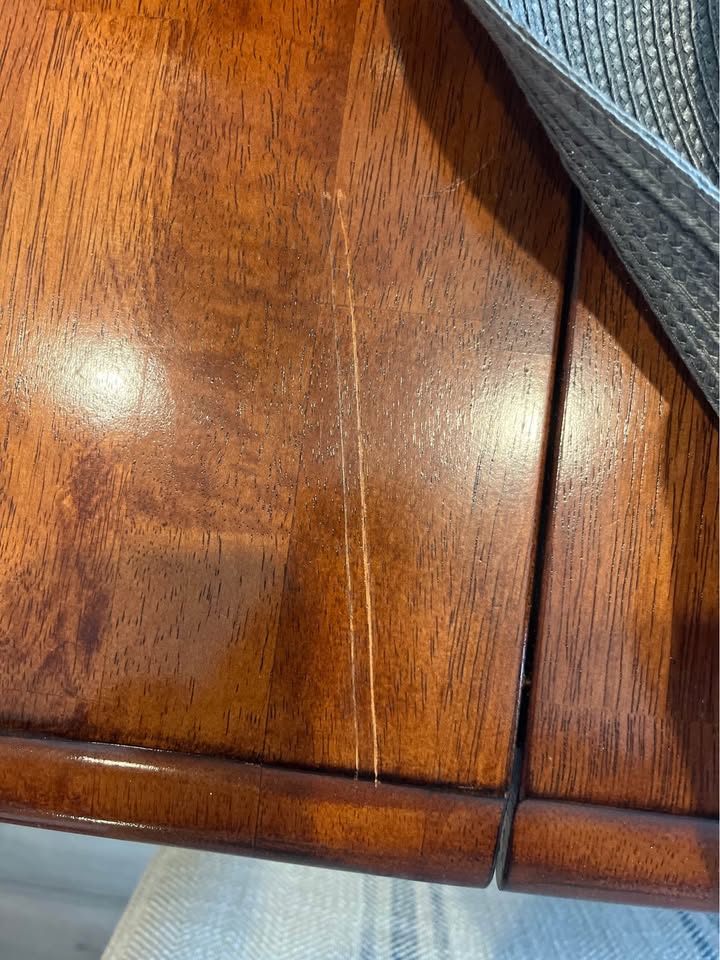Beautiful table with one leaf. One small scratch as pictured. Located in woodland. No chairs or decorative items included.