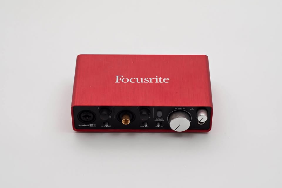 This is a Focusrite Scarlett 2i2 (2nd Gen) in great working condition. Both mic/line inputs, gain knobs, monitor controls, and headphone output work perfectly. It delivers clean preamps, low noise, and 24-bit/192k recording — perfect for vocals, instruments, podcasting, or a simple home studio setup.