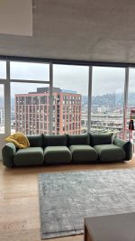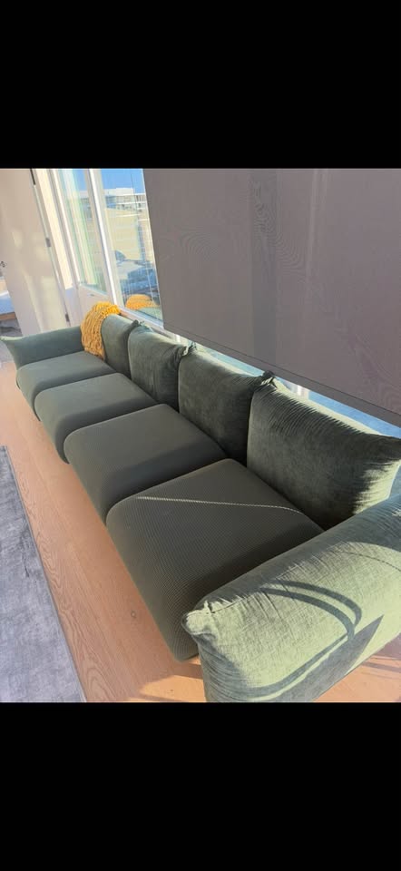 Couch we don’t want to take across country on our move with us. Only 1 year old! Great color and great statement piece. I have the original couch cushions and will give them to you as well, just didn’t want to get them dirty so I use covers.
