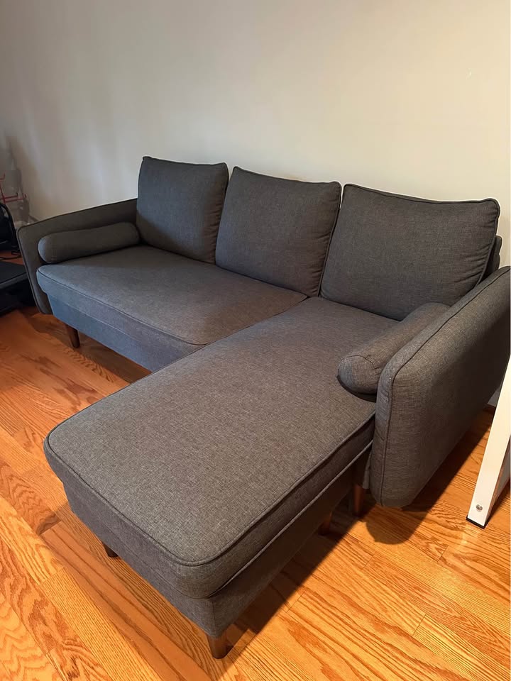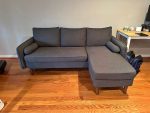 Clean, modern design couch that works well in apartments or small rooms. Grey fabric with wood legs and removable cushions.