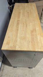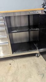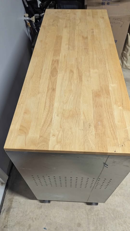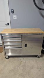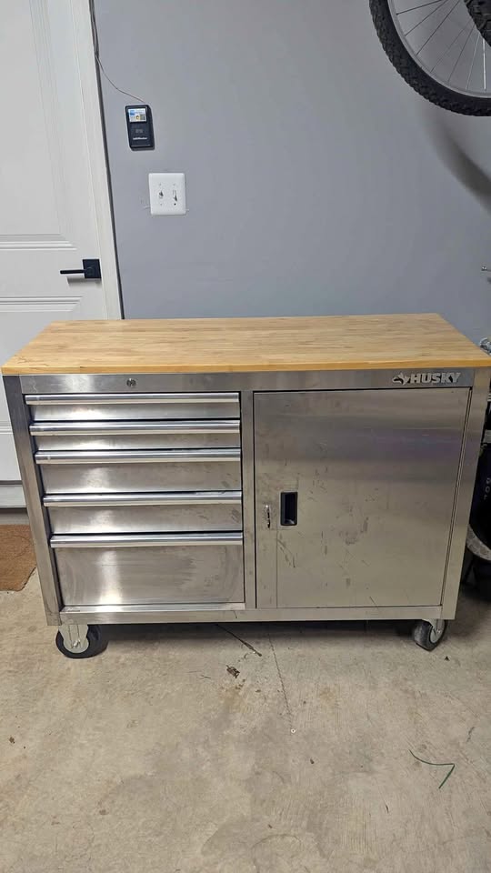 Stainless steel husky tool box / work bench. 5 drawers for tools and cabinet for larger items. Maple top in good shape.