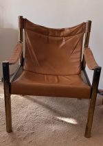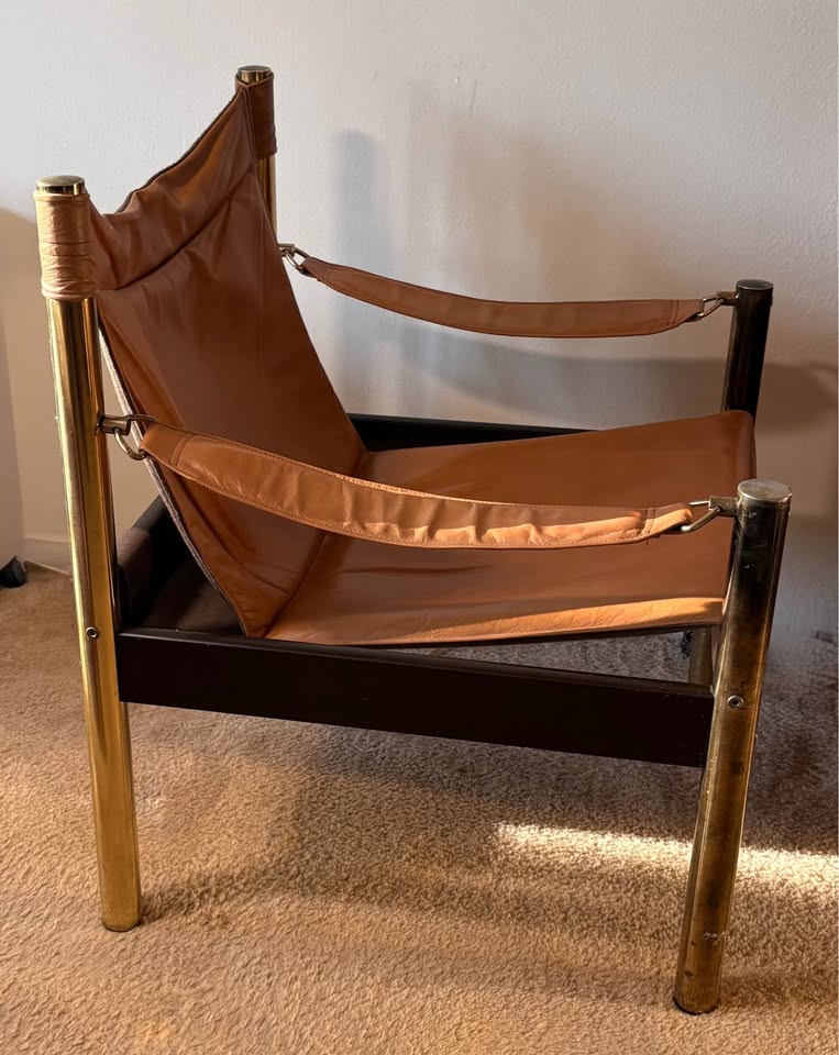 Leather with brass frame, Sling Arm Chair.