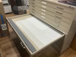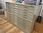 Two flat files that have been used for storing artwork. They measure 15 1/2″ tall, 46 3/4″ wide, and 35 1/2″ deep. 5 drawers per unit. Internal drawer depth 33, drawer width 43.