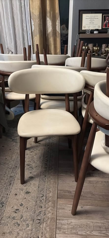 Beautiful chairs in wood available in white vinyl. Fully assembled. Purchased for our cafe but we bought too many.