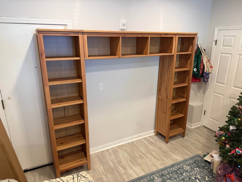 Two bookcases and a cross-piece that together make a media center. Could also put a desk in the middle, or even use the bookcases separately.