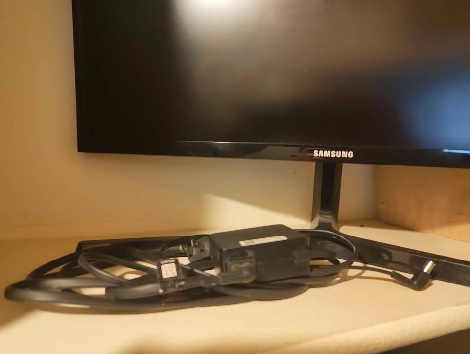 1920×1080 24inch Monitor from Samsung. Comes with the power cord and if you need an HDMI cable, I can include one free. The bezel has a tiny crack but doesn’t affect how it runs or anything.