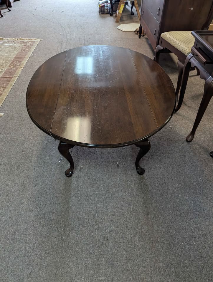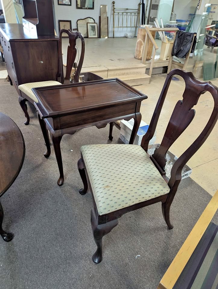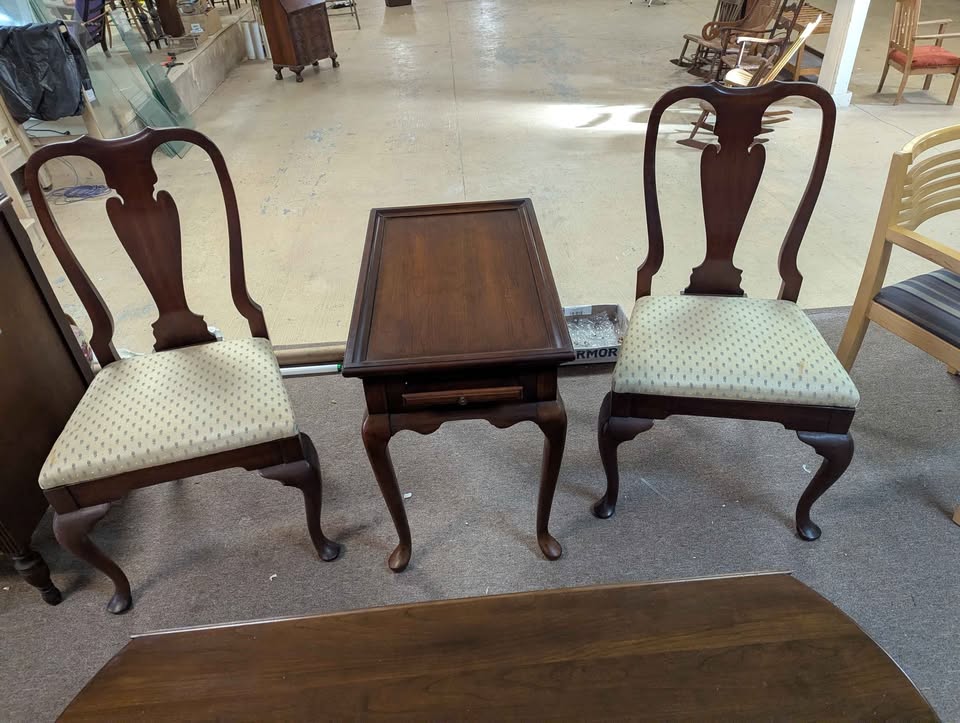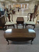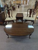 4 pieces of Cherry Furniture. 2 side chairs, coffee table and tea table with slide out trays.