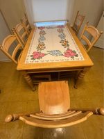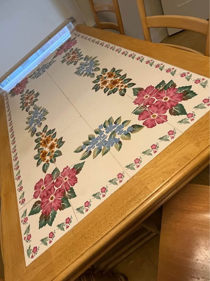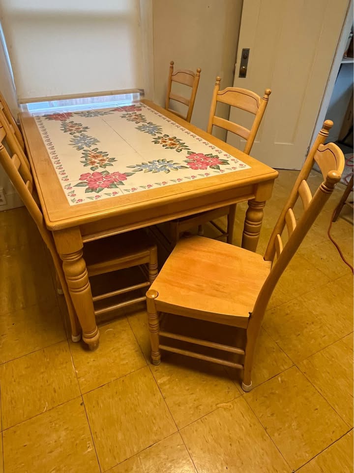 Selling this nice heavy wood table with 6 chairs. Lovely, colorful hand painted tiles set in the top of the table – Made in Thailand – it is 5’2” long by 3’3” wide and about 30 inches tall.