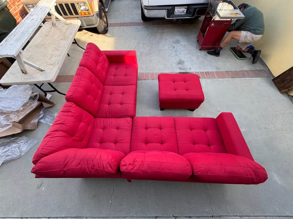 Selling a stylish 3-piece red sectional sofa with matching ottoman.