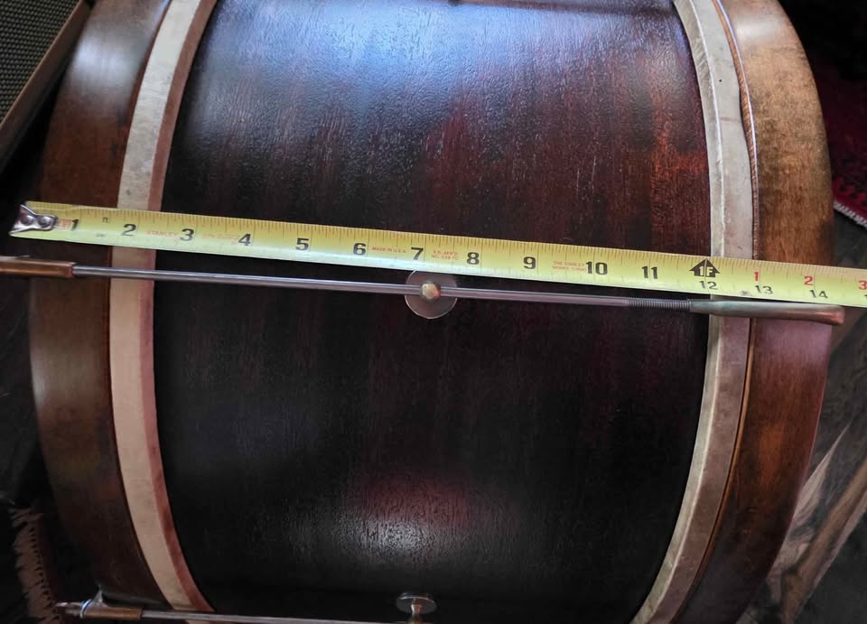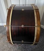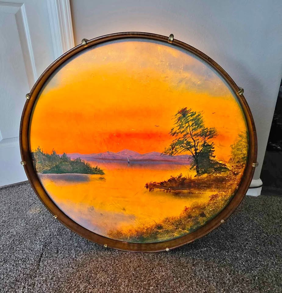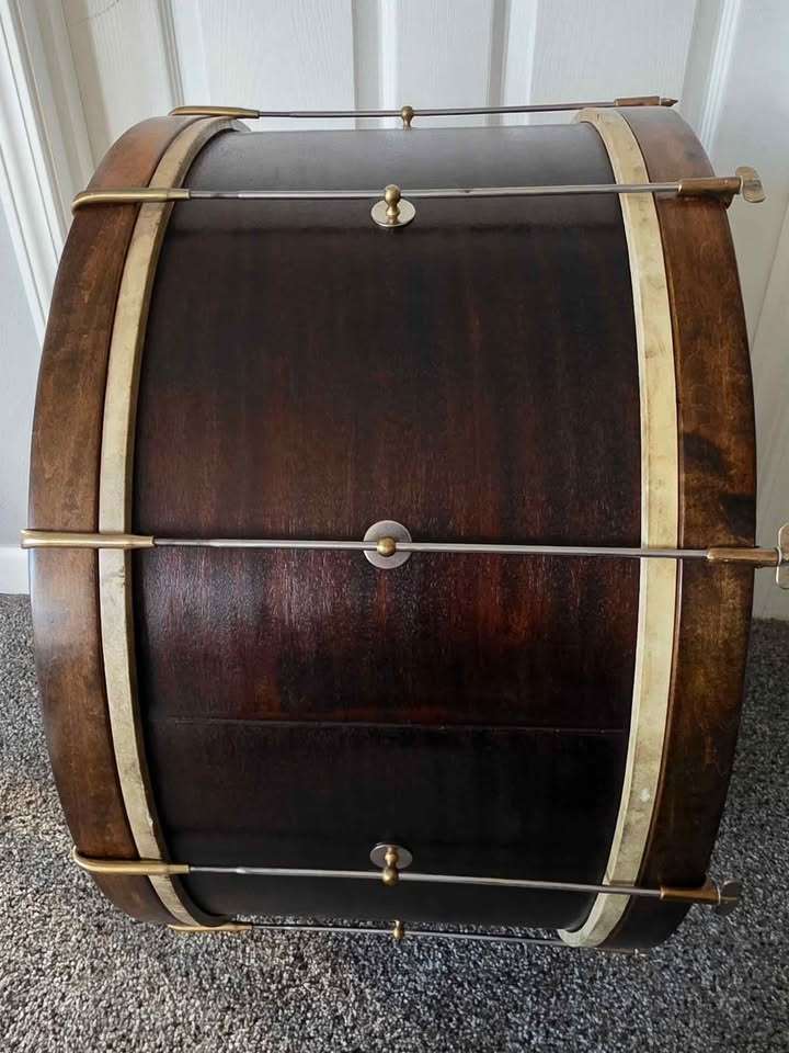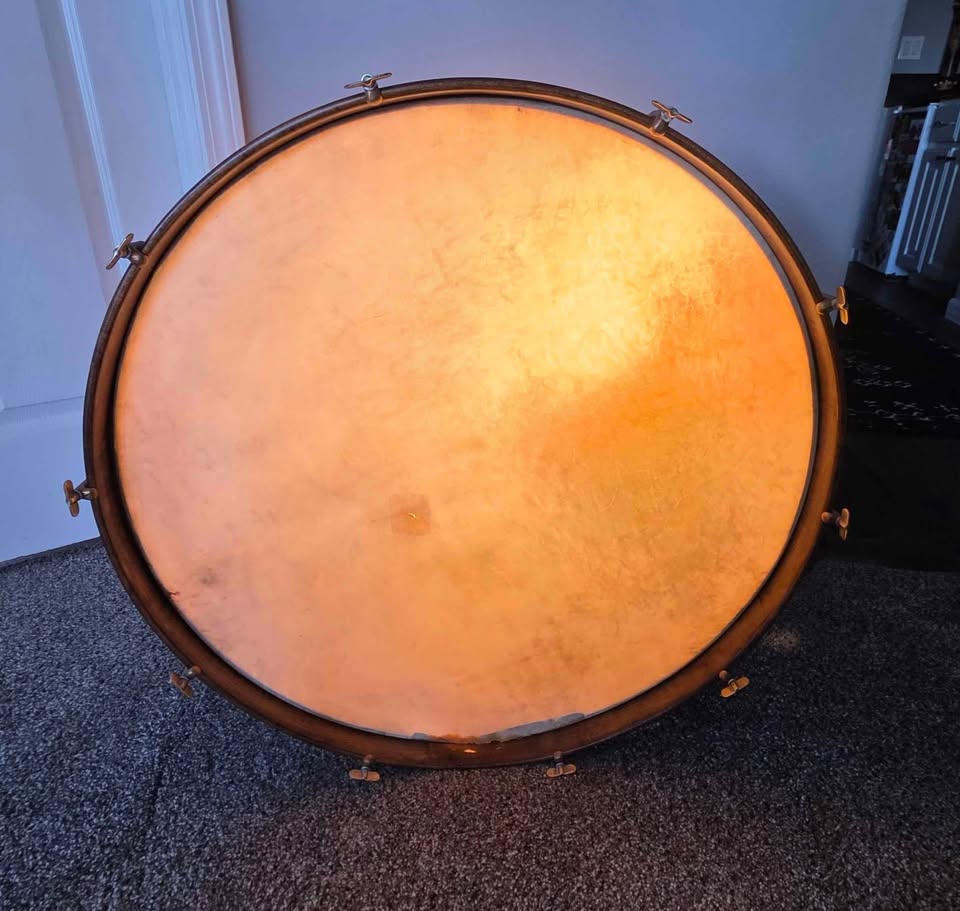 Restored vintage parade bass drum with original calf skin heads from the 1920’s. When I received this drum, it was in rough shape. I refinished the shell, hoops and hardware to its current condition. It’s equipped with the original calf skin heads with original painted mural on one of the heads. It also lights up, so how cool is that!!