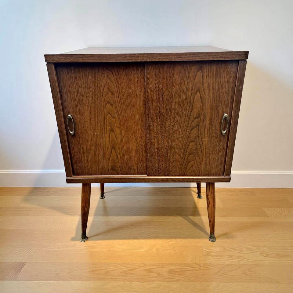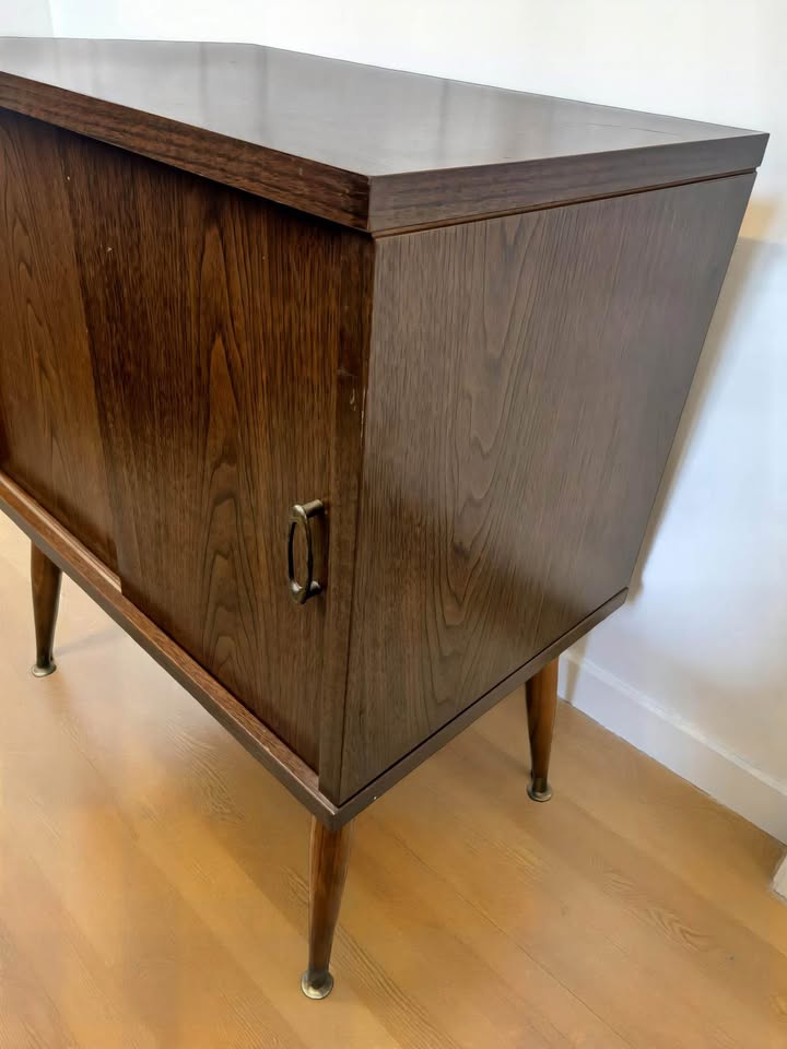 Beautiful authentic Lu Van brand mid-century modern cabinet featuring classic sliding doors, and original oval brass pulls. Clean lines and tapered legs make this a timeless piece that works perfectly as a record cabinet, bar cabinet, or storage of any kind.