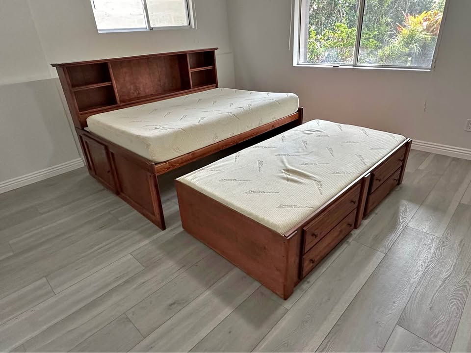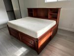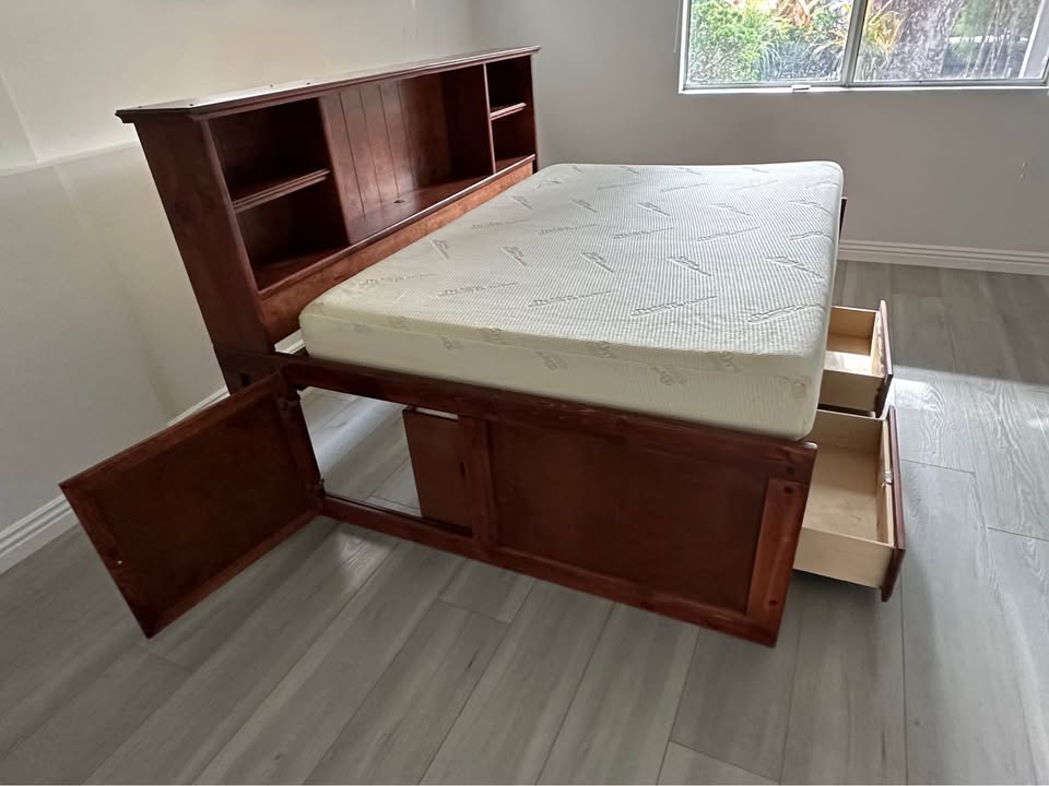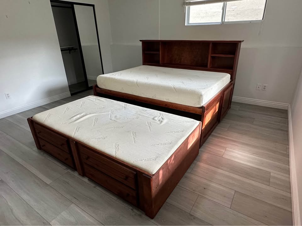 Selling a full sized wooden platform bed with shelves and drawers plus a pull out twin bed and under bed storage via an access door. Includes comfy gel mattresses, both in great condition. Full bed measures 80” long x 66” deep ( sits sideways),