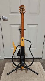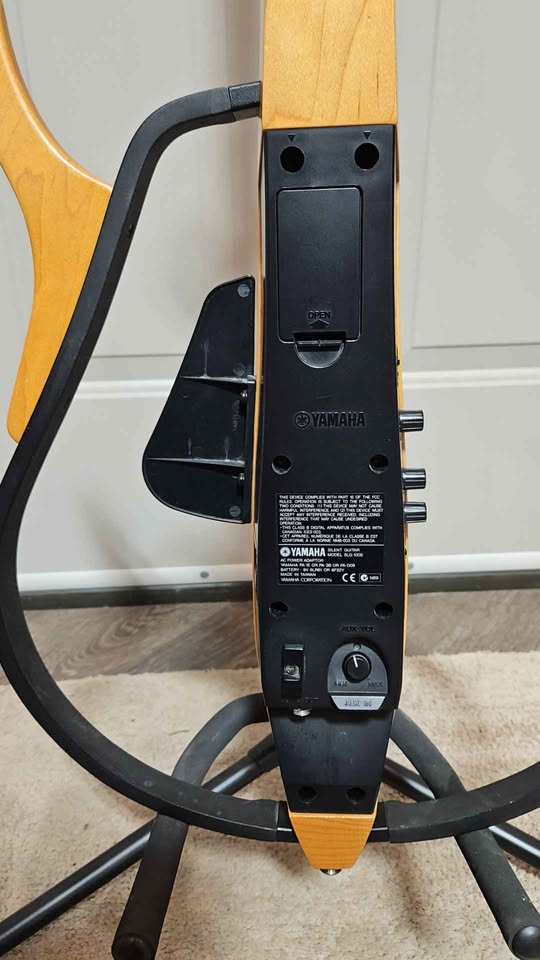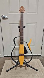 Nice working Yamaha steel string silent guitar. It can be played loke an electric guitar or it can be played silently with headphones. It has a built in headphone amplifier. No more disturbing others while practicing or just jamming. In great shape. With original case.